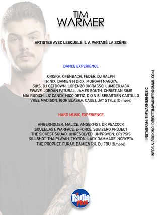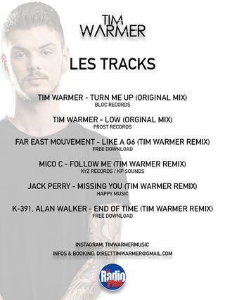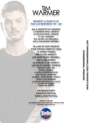 ARTISTE FRANÇAIS ORIGINAIRE DE LA VILLE DʼANNECYTIM WARMER TRAVERSE RÉGULIÈREMENT LA FRONTIÈRE POUR SA RÉSIDENCE AU VILLAGE DU SOIR GENEVE.HABITUÉ DES DANCEFLOOR FRANCOS- SUISSES, SA SELECTIONSURVITAMINÉE ET TRUFFÉE DE CLINS DʼOEIL REMIXÉS À SA GÉNÉRATION 90_2000 A SÉDUITE DES CLUBS PARTOUT EN FRANCE.APRÈS AVOIR SORTI UN REMIX DU TITRE LIKE A G6 EN 2020, IL SE VERRA SUPPORTÉ PAR DES ARTISTES INTERNATIONAUX CE QUI LUI PERMETTRA DE COLLABORER AVEC DʼAUTRES ARTISTES TELS QUE MICO C (FUN RADIO) ET JACK PERRY (RADIO FG) ET DʼÊTRE JOUÉ SUR FUN RADIO, NRJ, ROUGE FM (suisse), etc.RESIDENT DE LA RADIO PLUS DEPUIS 2020 TIM WARMER DEBARQUE CHEZ VOUS ET IL NE VIENT PAS POUR FAIRE SEMBLANT.